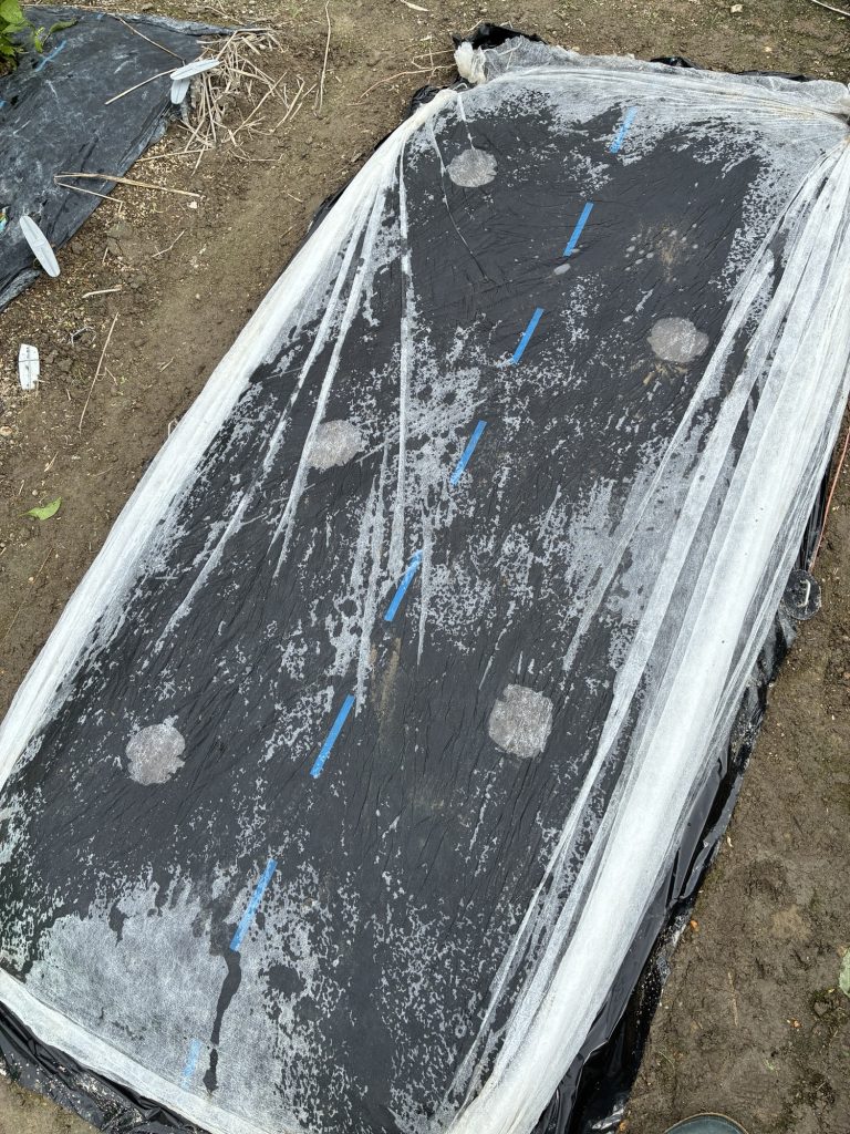 上から古いマルチ(雨がかかると土が固くなる)を。